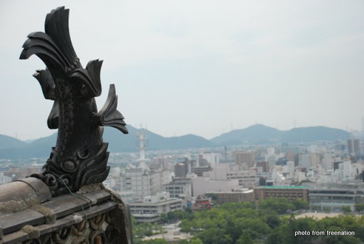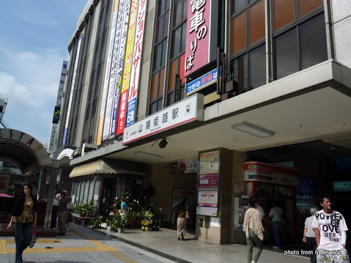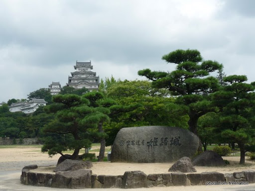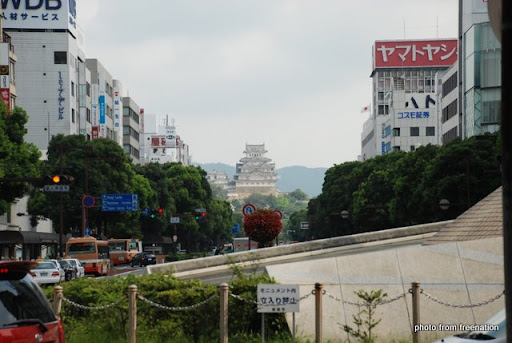 搭乘新幹線或JR電車到JR姬路車站,出站東口,站前廣場前便是一條筆直的寬闊的大道,沿大道走到盡頭,一座白色的城池突現眼前,這便是姬路城。