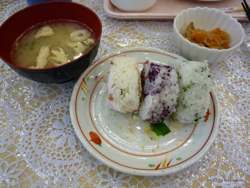 除了飯糰外,還有小菜、 味噌湯,不過味增湯可能會不合台灣人的口味,口味偏鹹~